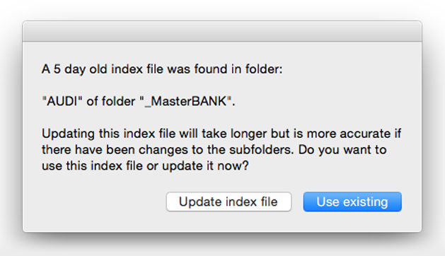 • The first optional setting is to tell the script how it should handle existing index files. You can choose to always update, never update or ask every time. Depending on the number of subdirectories, it may take from seconds to minutes to build an index file. This is why using an existing index file can save you time. Also depending on how often the folder structure changes, you may not need to re-index for some time.